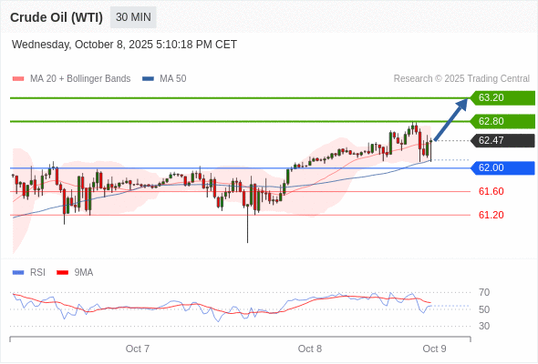 在 62.00 之上,看涨,目标价位为 62.80 ,然后为 63.20 。