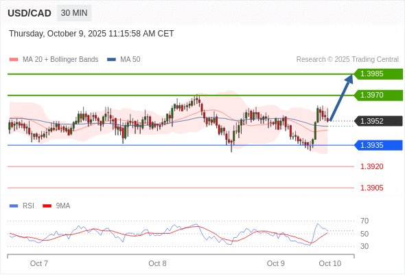 在 1.3935 之上,看涨,目标价位为 1.3970 ,然后为 1.3985 。