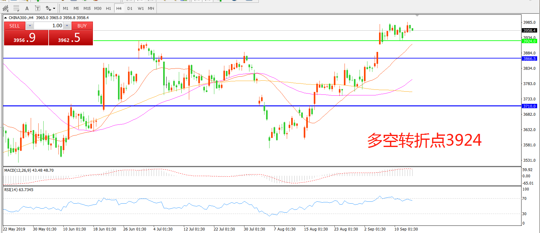 4小时图看,沪深300指数震荡走高,3924企稳后地点逐渐抬高,整体走势依然偏强,均线系统呈多头排列,MACD红柱增加,RSI指标走平,日内延续上行概率较大。