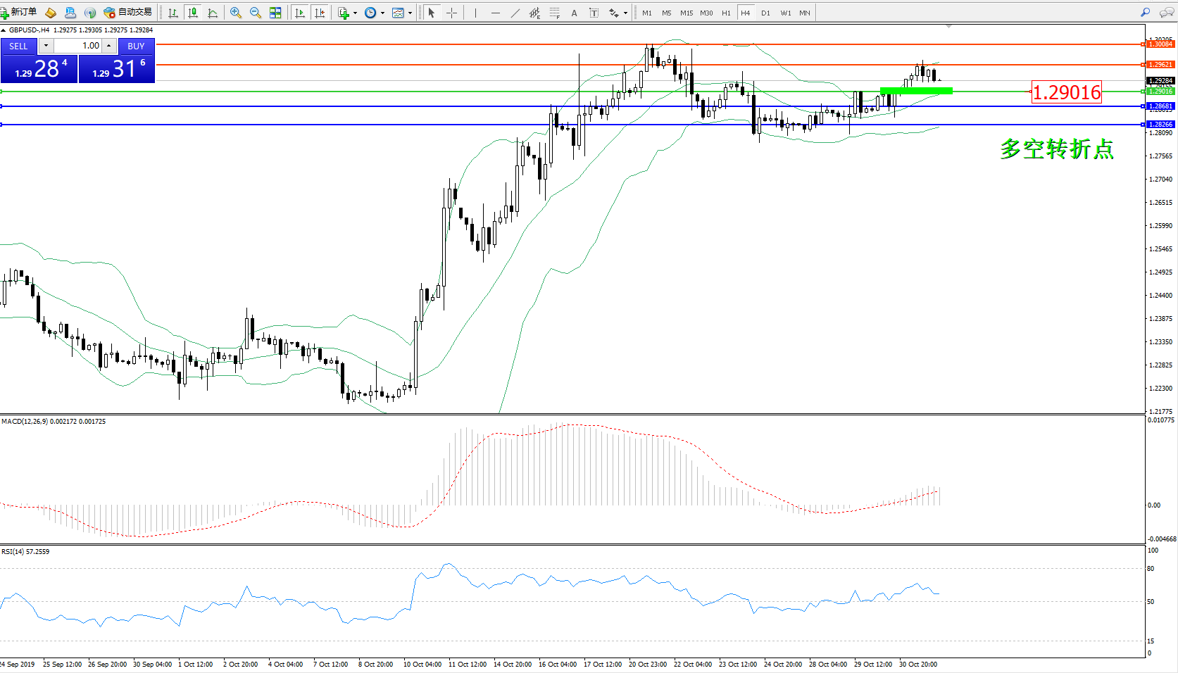 交易策略:1.2906上方看涨,目标1.29621、1.30084