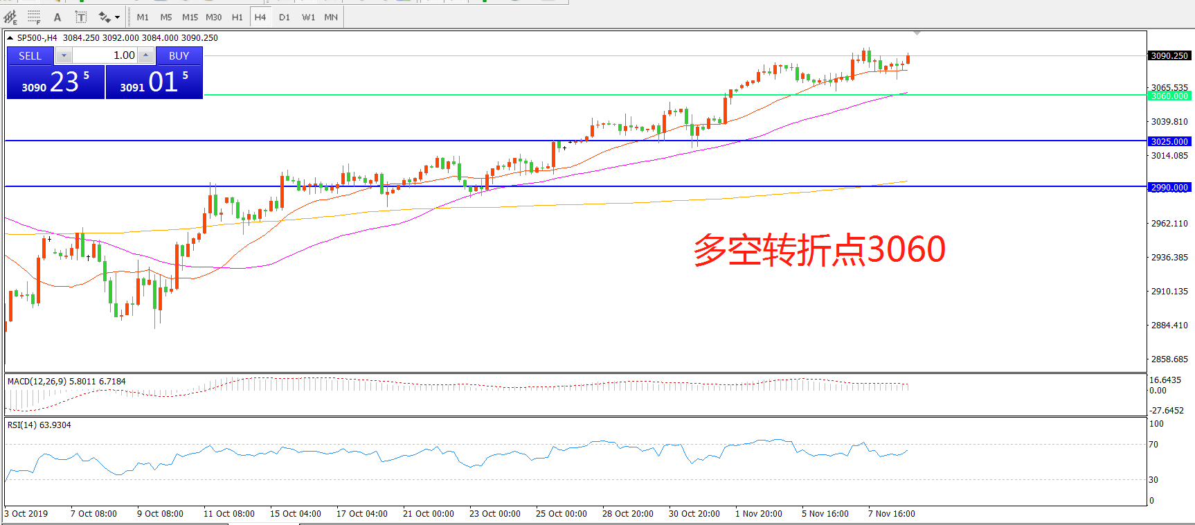 4小时图看,标普500维持高位震荡,整体走势偏强,回踩3060支撑之后上行趋势较为明显,均线系统呈多头排列,MACD红柱减少,RSI指标向上,日内延续上行概率较大。