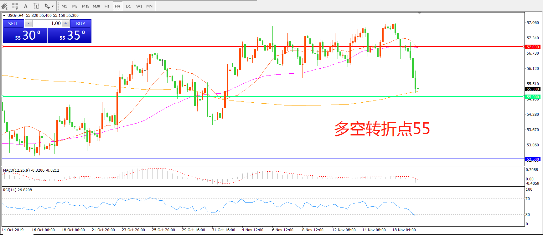 4小时图看,油价阴线连续下挫,短期走势偏空,55美金成为短期支撑,均线系统有形成死叉迹象,MACD绿柱增加,RSI指标走平,短期有下行风险。