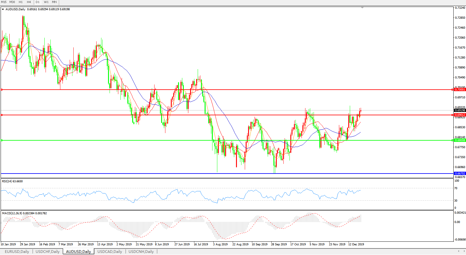 澳元兑美元在周一延续强势,有望连续第四个交易日收高,并最终实现上破站稳200日均线的目标。澳元汇价近期继续强势,主要受到全球贸易局势趋于缓和,同时各主要经济体仍有望在2020年进一步推行经济刺激措施,这对出口原材料的澳洲经济前景构成持续利多,令其领涨非美货币;澳元兑美元日内因而重新升破0.69关口,并站上200日均线切入位,若能在日内收盘守住0.6904这一点位,则中期走势反转可期,下一步阻力目标在前期高点0.6939。鉴于自2018年4月以来澳元兑美元汇价从未在日线收盘站稳于200日均线上方,这一突破配合上更多贸易领域基本面利多消息,将推动澳元在来年打开更大的反弹空间
