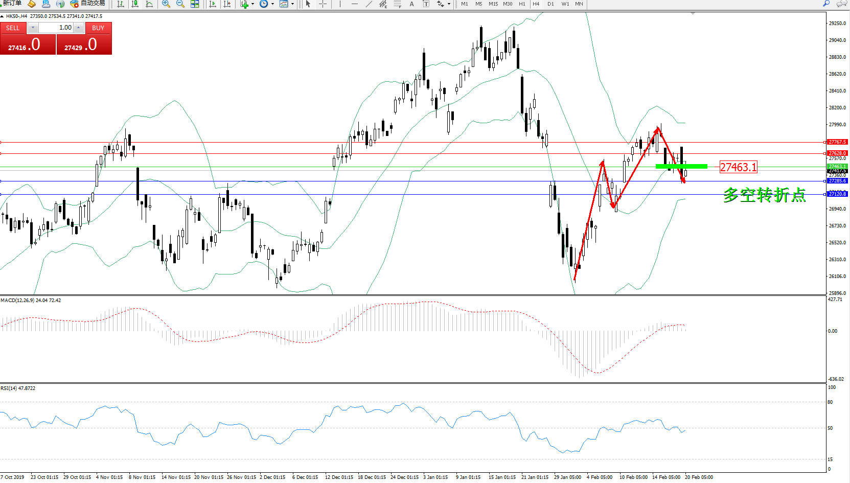 恒指HK50 ——4小时K线图显示: