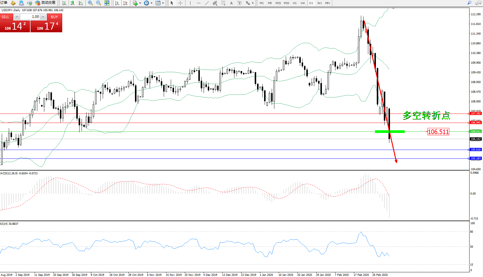 交易策略:106.511下方看跌,目标105.616105.183