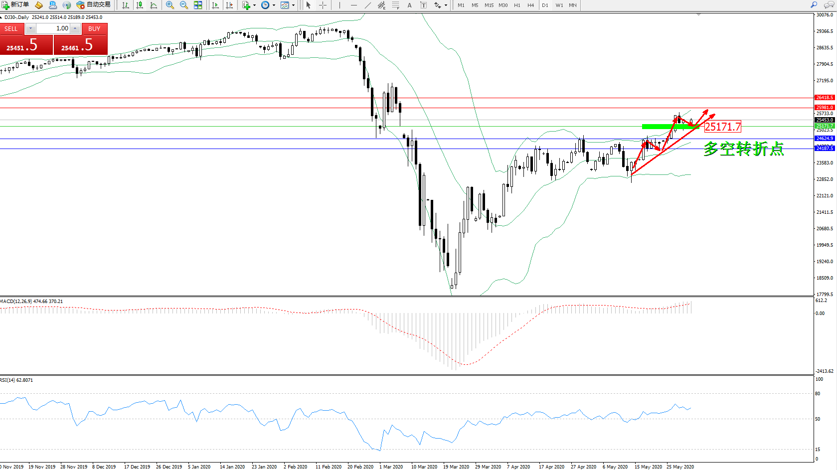 交易策略:25171上方看涨,目标25981、26418