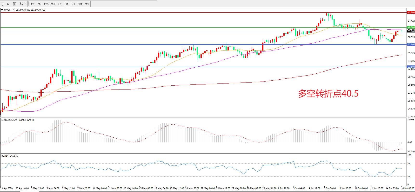 4小时图看,油价呈现区间震荡走势,37美元成为短期支撑,40.5美元成为短期阻力,均线系统逐渐粘合,MACD绿柱缩短,RSI指标走平,日内延续震荡概率较大。