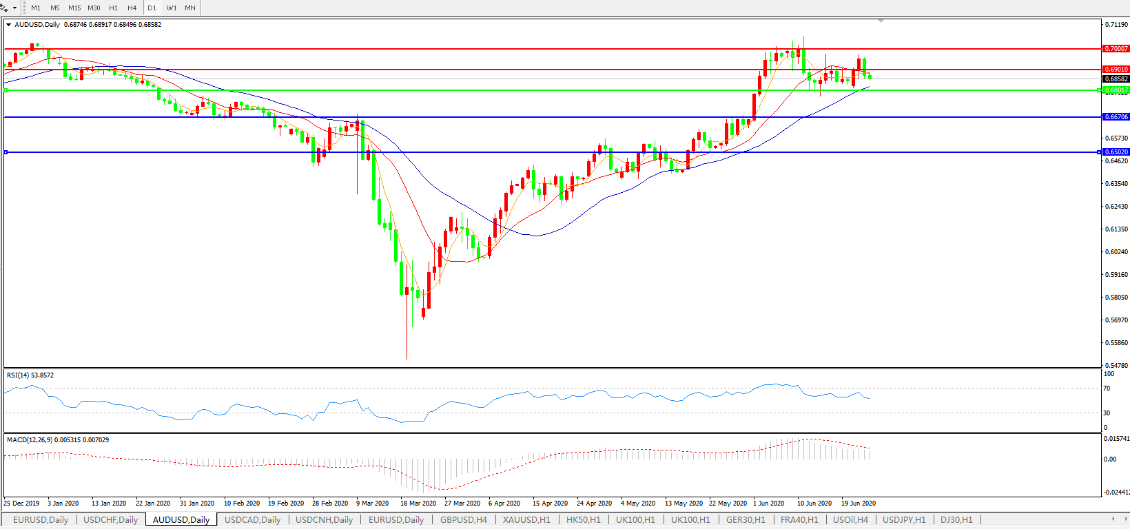 技术面简析:日图短期均线高位粘合走弱,汇价上攻乏力后快速下行,MACD运行于0轴上方且量能持续缩量,RSI再度走低,预计汇价短线大概率将继续整理,关注0.6800关口支撑。
