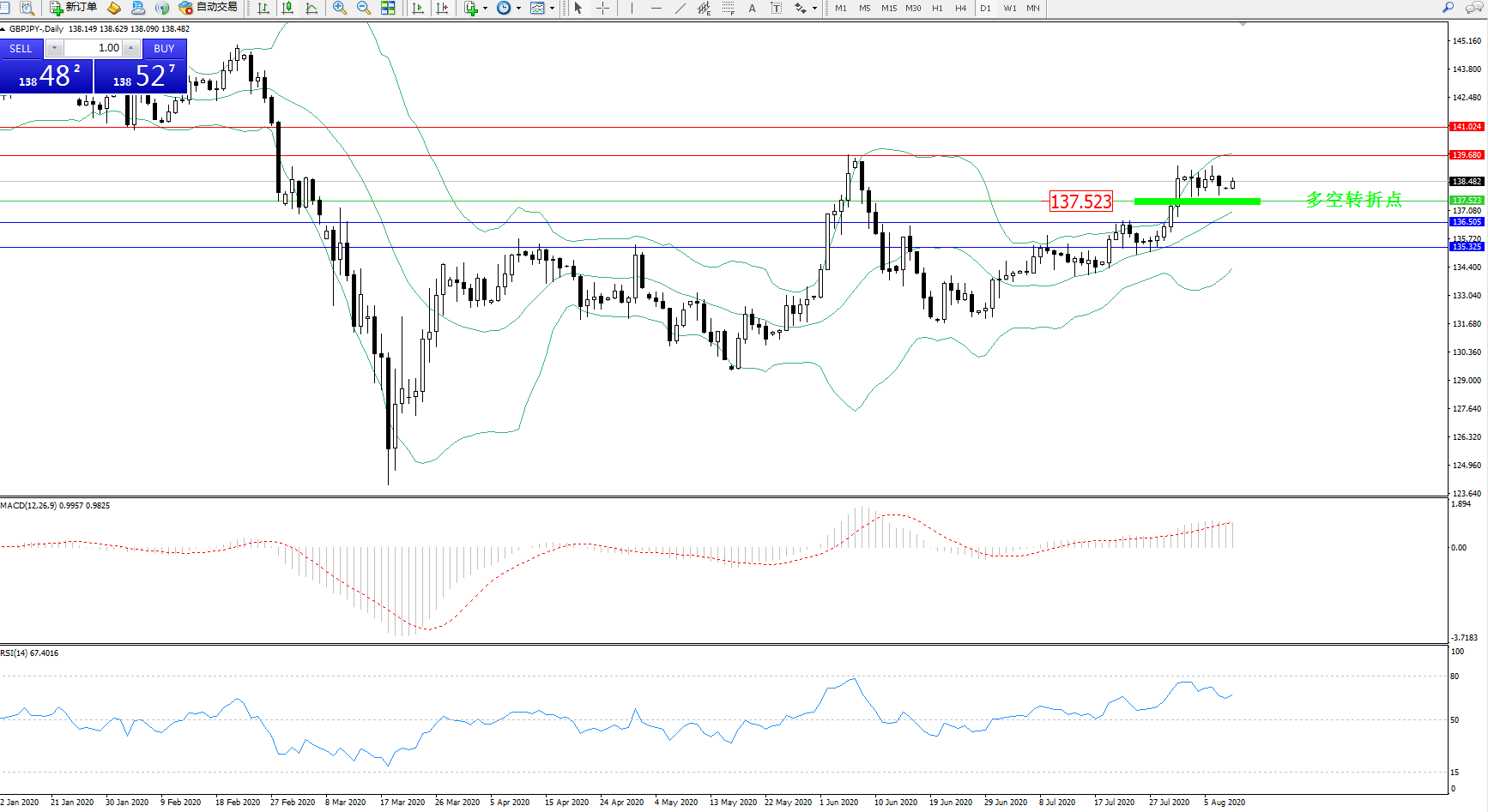 英镑兑日圆弱势震荡138.515附近,市场对英国本土的疫情和英国脱欧谈判前景持相对乐观态度;此前英国与日本进行的贸易磋商进展顺利,意味着英国有序脱欧在“第二战场”上取得阶段性胜利,与此同时,英国首相约翰逊宣布该国学校今秋可以正常开学,也令此前受到疫情负面消息持续打压的风险情绪难得地出现了改善;不过,日内英镑汇价反弹幅度仍然受限,上方在1.31关口仍有强阻力。市场目光提前转向周二即将发布的英国就业数据,在此之前,汇市整体上仍呈现盘整蓄势态势。英日双边贸易协定的多数领域达成实质协议,将设法在8月底前敲定协议大纲。据报道,日本外务大臣茂木敏充表示,“我们同意加快谈判进程,希望在8月底前对协议大纲达成一致。”