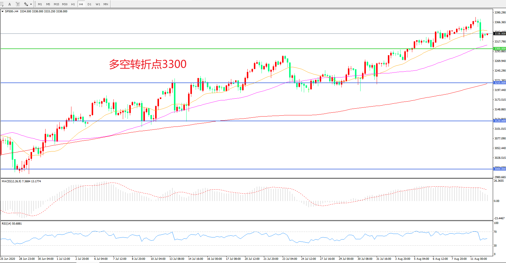 周二(8月11日),新出炉的经济数据向好,投资者风险偏好增强,美股一度强势走高,但美国新冠确诊人数再创新高,打压了市场信心,标普500尾盘跳水,收报3333点。目前标普500指数距离历史最高水平仅一步之遥,能否突破早前重要的心理关口十分关键,国际形势和美国政府刺激计划何时推出,都是本周影响市场的重要因素。”