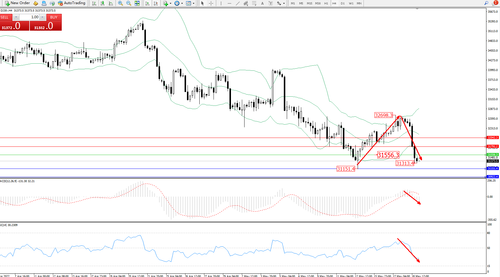道琼斯指数5月18日(周三)收盘下跌1168.21点,跌幅3.58%,报31486.38点,美股收盘,三大股指今日单边下挫,道指重挫约1200点。标普下调美国经济增长预测。预计美国经济增速将下降80个基点至2.4%,下调预测的理由包括能源和大宗商品价格上涨,俄乌冲突时间长于预期,货币政策正常化加速。