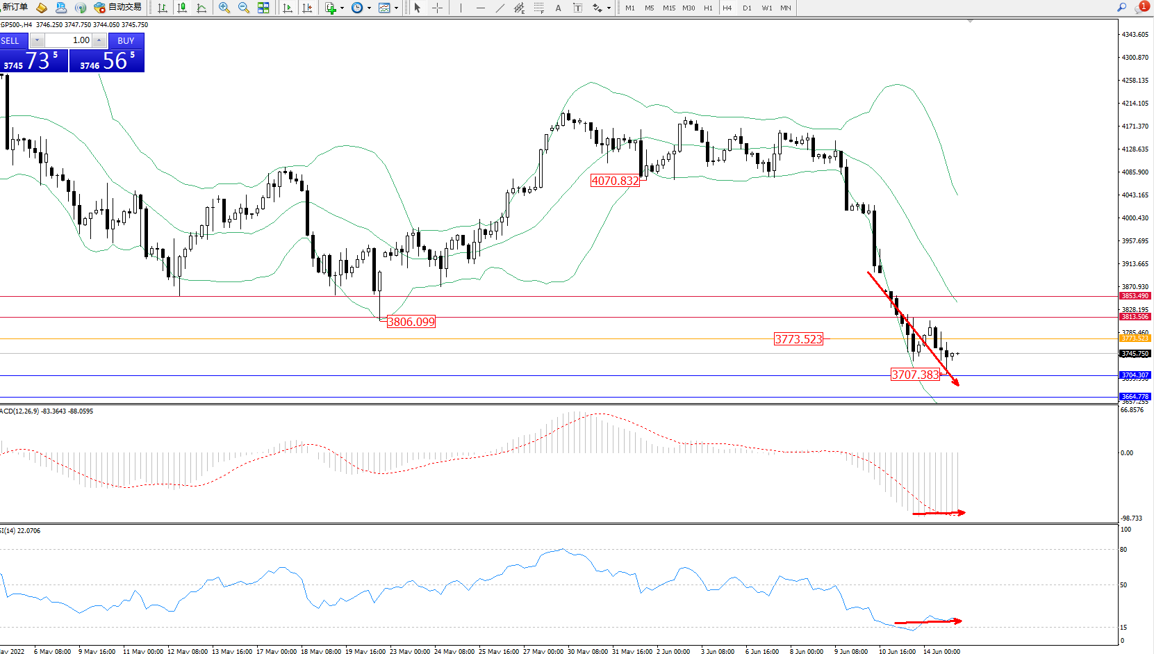 技术点评:空头力动力延续布林带指标下轨附近持续下挫,低位抵达3707附近震荡中,短期空头下行走势良好,布林带指标呈收口走势不断下行,MACD指标处于空头区域底维持整理平移,RSI指标处于空头区域底位维持弱势徘徊中;