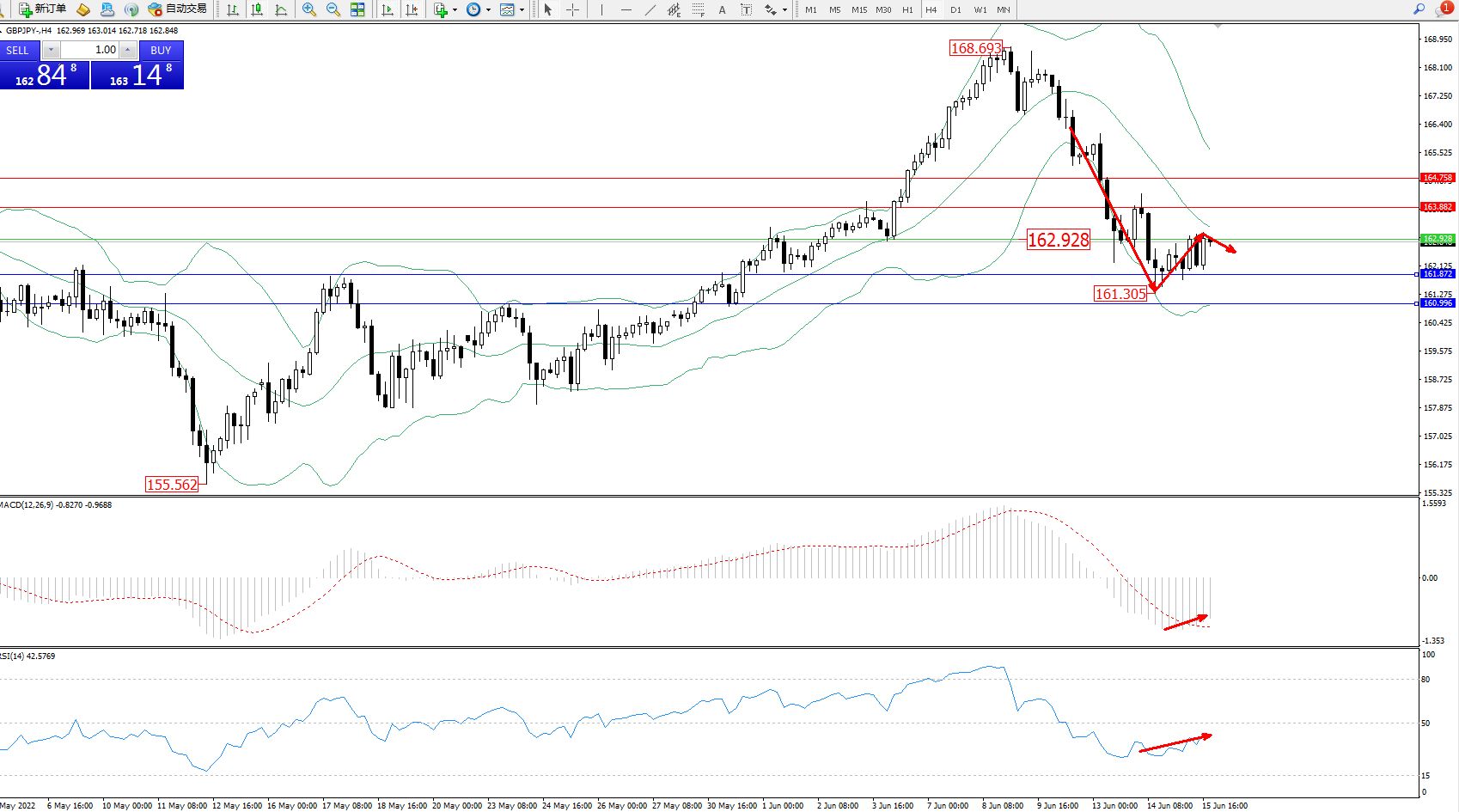 技术点评:空头动力延续布林带指标通道中下轨区间持续震荡下行,低位抵达161.305附近节点后得到支撑整理,短期维持弱势震荡,布林带指标呈收口走势在,MACD指标处于空头区域低位维持弱势徘徊,RSI指标处于空头区域维持窄幅整理上移;