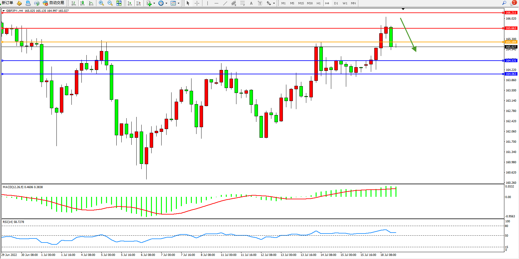 4小时图看:多头动力维持震荡上扬走势态势,高位短期遇阻回撤,空头动力开始伺机入场,MACD指标处于多头区域高位整理平移,RSI指标处于50均衡线上側弱势徘徊中;