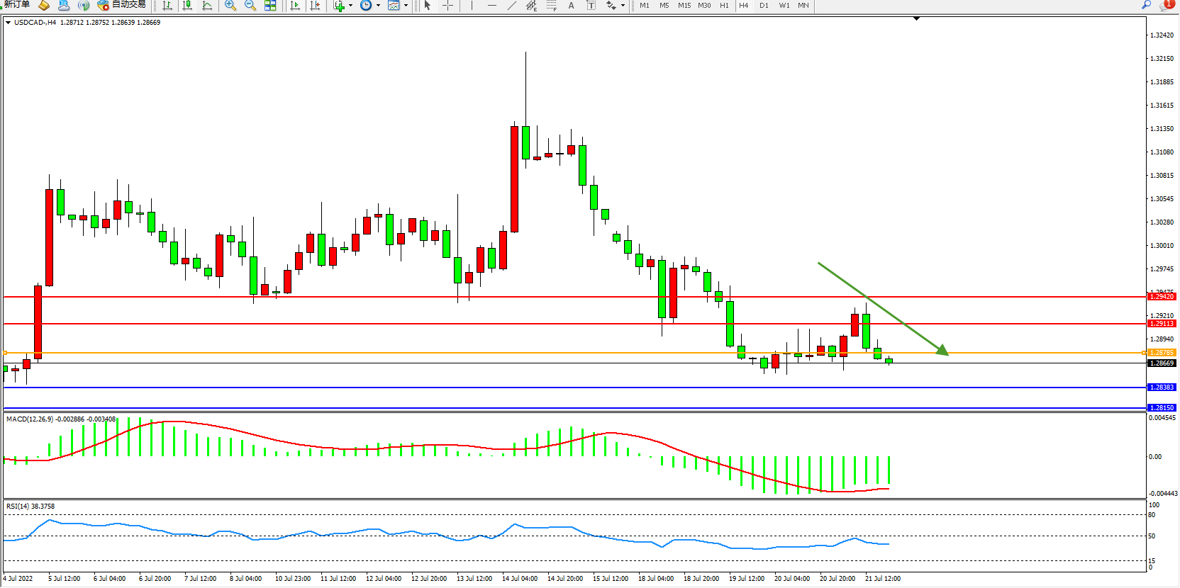 美元加元USDCAD——4小时K线图显示: