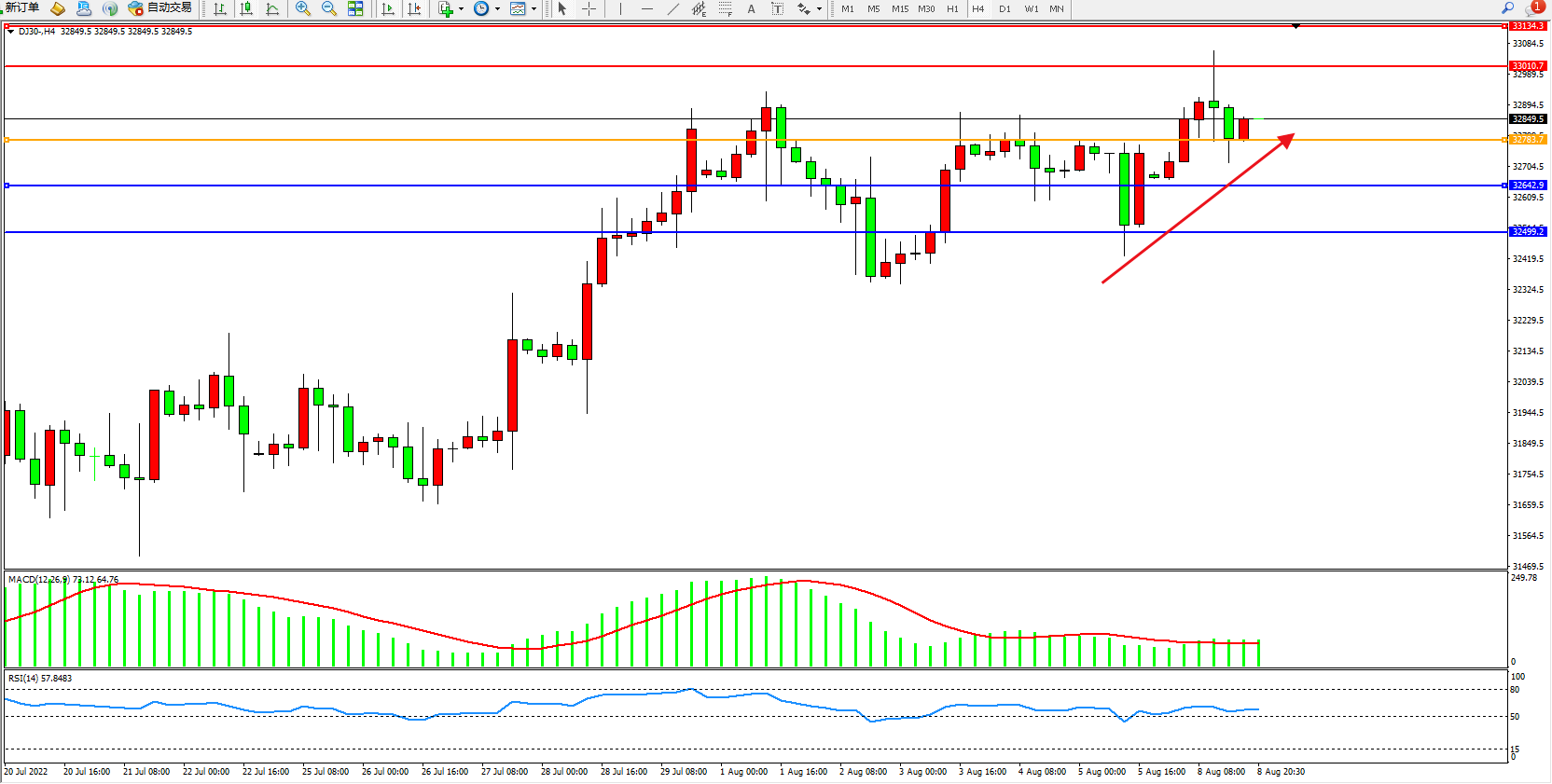 道琼斯指数8月8日(周一)收盘上涨28.45点,涨幅0.09%,报32831.92点;联邦基金利率期货交易员现在预计,9月份再次加息75个基点的可能性为69%,到3月份联邦基金利率将从现在的2.33%上升至3.62%。