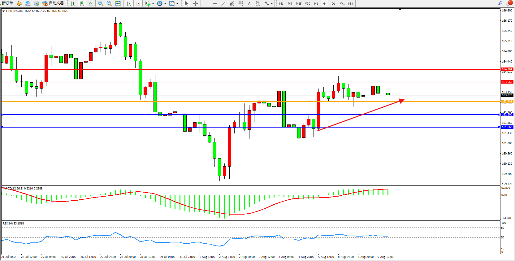 4小时图看:低位多头动力震荡上移,开始维持窄幅整理平移,波幅空间逐渐收窄,MACD指标处于0轴线上側徘徊,RSI指标处于50均衡线上側弱势整理;
