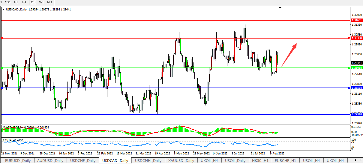 日线图看:短期汇价迅速拉升后小幅回踩,MACD运行于0轴下且量能小幅缩量,RSI整理中,预计短期汇价大概率将在回测整理后进一步上行。