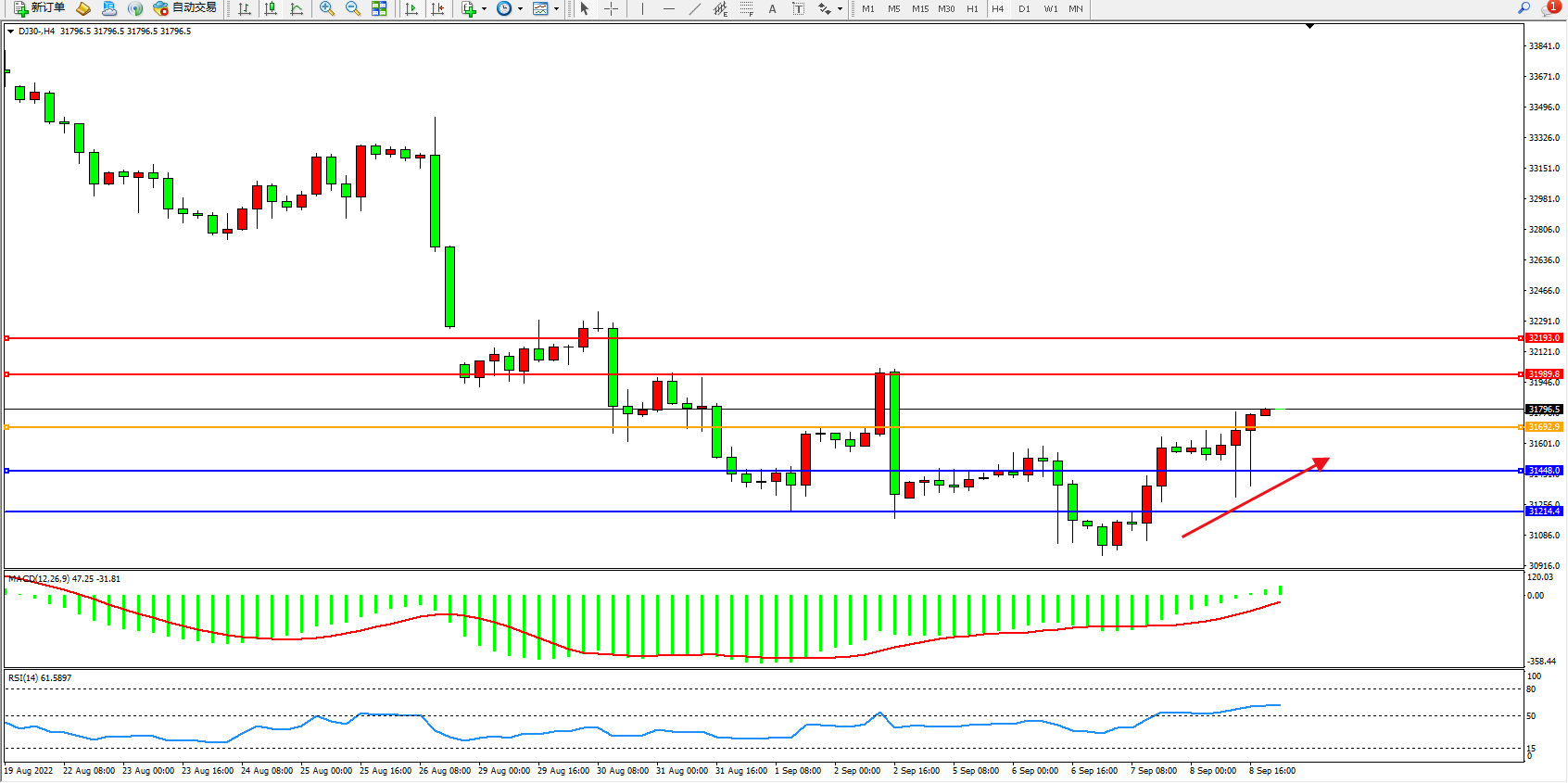 4小时图看:低位多头动力维持窄幅整理缓慢上行,短期多头有继续向上移动态势,MACD指标处于0轴线上側弱势徘徊,RSI指标处于50均衡线上側窄幅整理;