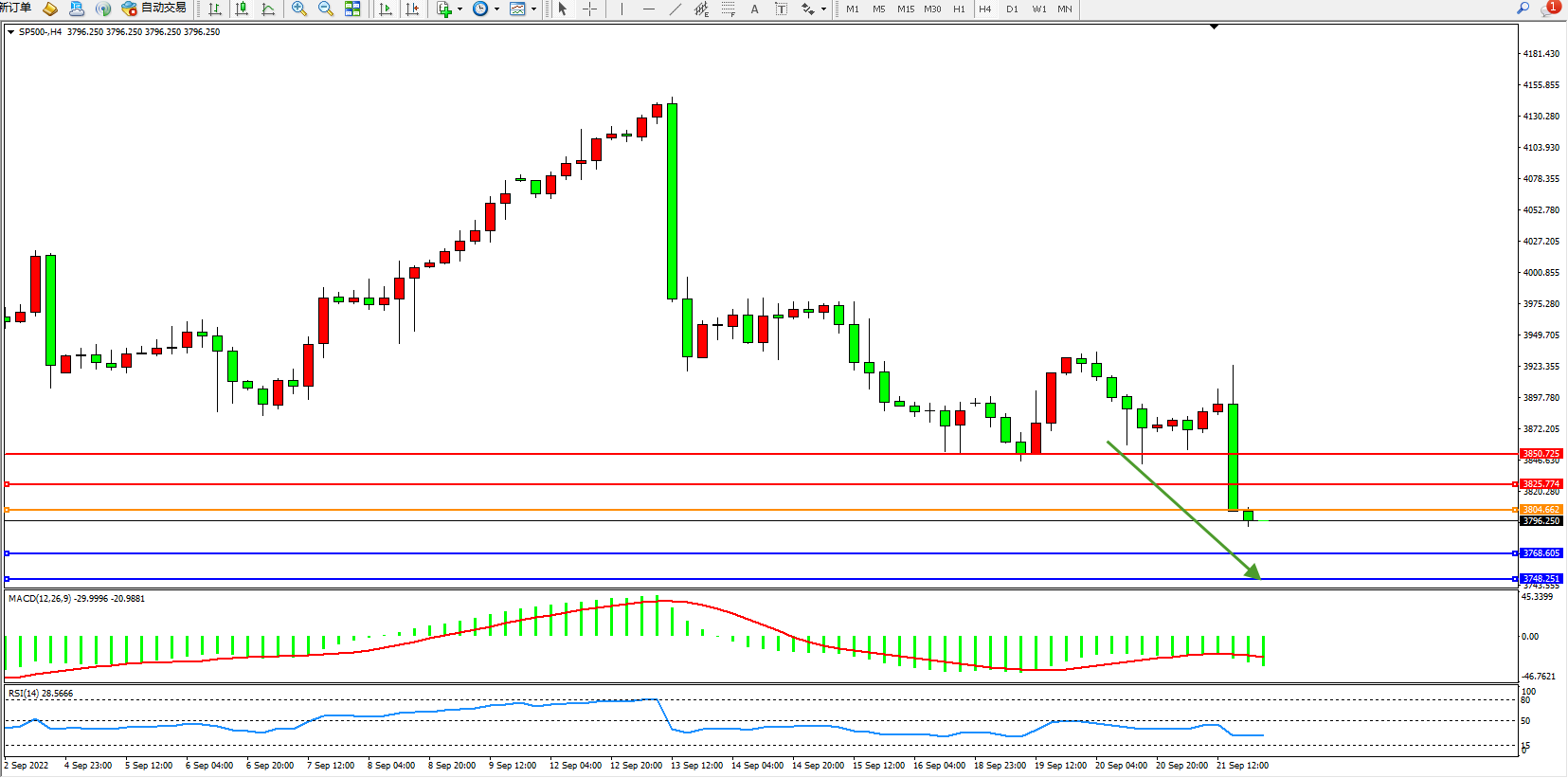 标普500指数9月21日(周三)收盘下跌66.54点,跌幅1.73%,报3789.39点;根据美联储的季度经济预测,2022年经济增长将大幅放缓,年增长率为0.2%,2023年回升至1.2%,远低于经济的趋势增长率。