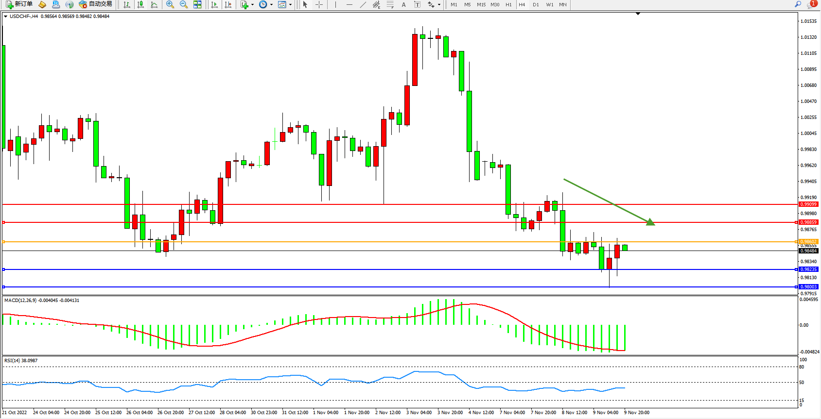 美元兑瑞郎维持0.98602附近震荡,美联储在12月会议上至少加息50个基点,但连续第五次加息75个基点的可能性不到45%。瑞郎被视为通胀对冲工具,美国中期选举的初步结果显示,共和党有望赢得参议院和众议院的多数席位,利多债市,利空美债收益率和美元指数,也偏向给瑞郎提供支撑。