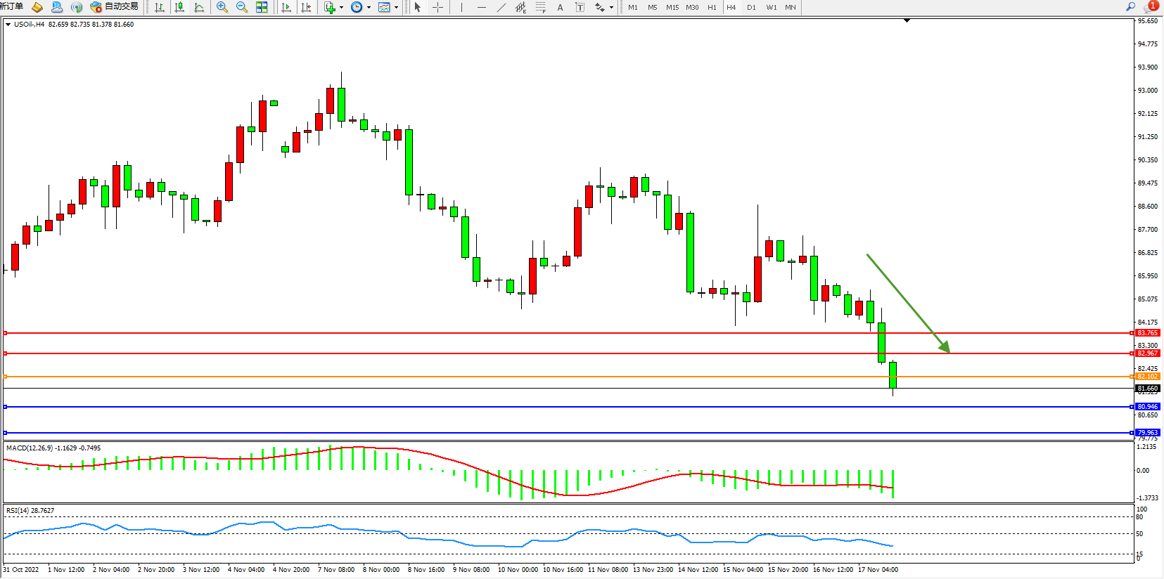 4小时图看:空头动力持续下行,短期跌势未见止步,市场整体下行趋势态势良好,MACD指标处于空头区域持续下移,RSI指标处于空头区域维持整理下行中;