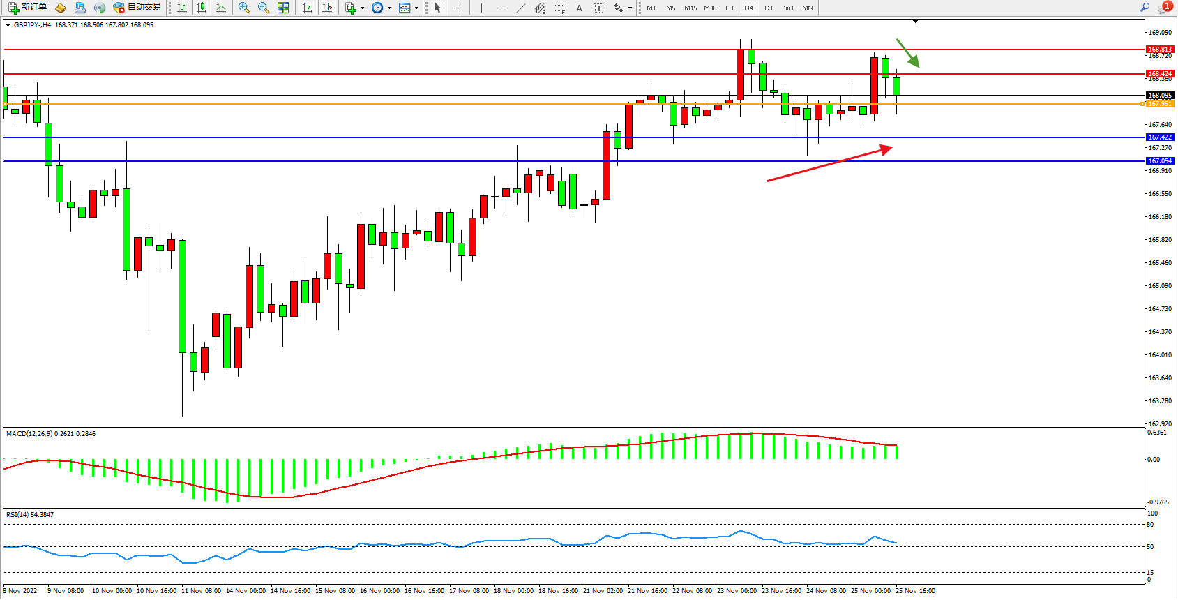 备选策略:167.951下方看跌,目标167.422、167.054