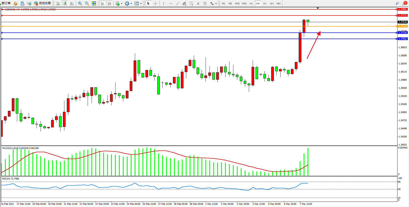 4小时图看:高位多头动力急速拉升,市场看涨情绪笼罩,多头动力有继续向上移动态势,MACD指标处于多头区域强势拉升,RSI指标处于多头区域高位徘徊;