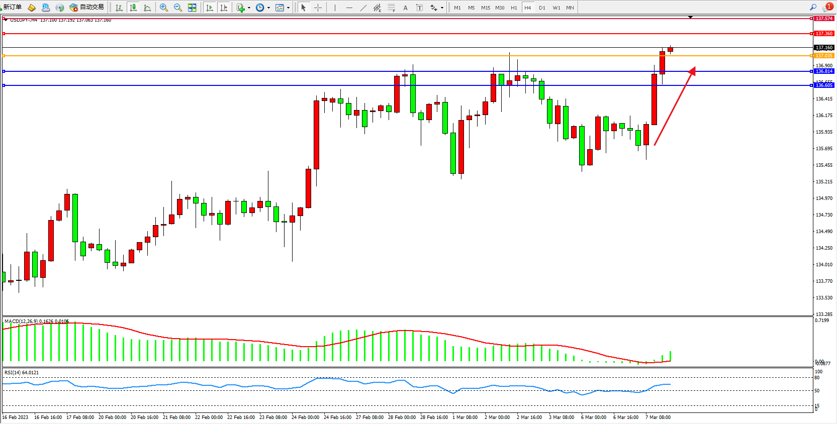 4小时图看:高位多头动力强势拉升,市场看涨情绪笼罩,多头有继续拉升态势,MACD指标处于0轴线上側上移,RSI指标处于50均衡线上側弱势整理;