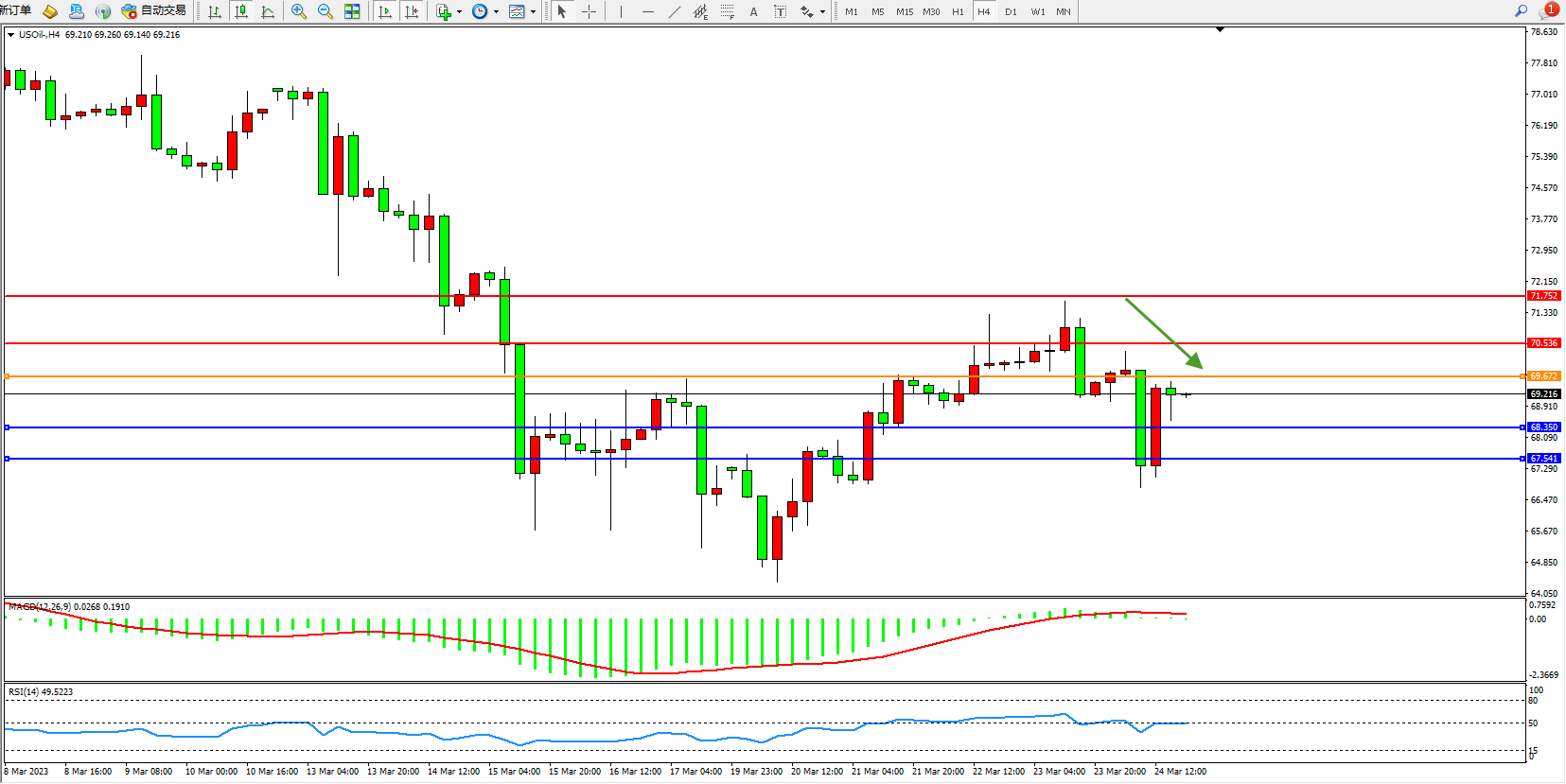 交易策略:69.672下方看跌,目标68.350 67.541