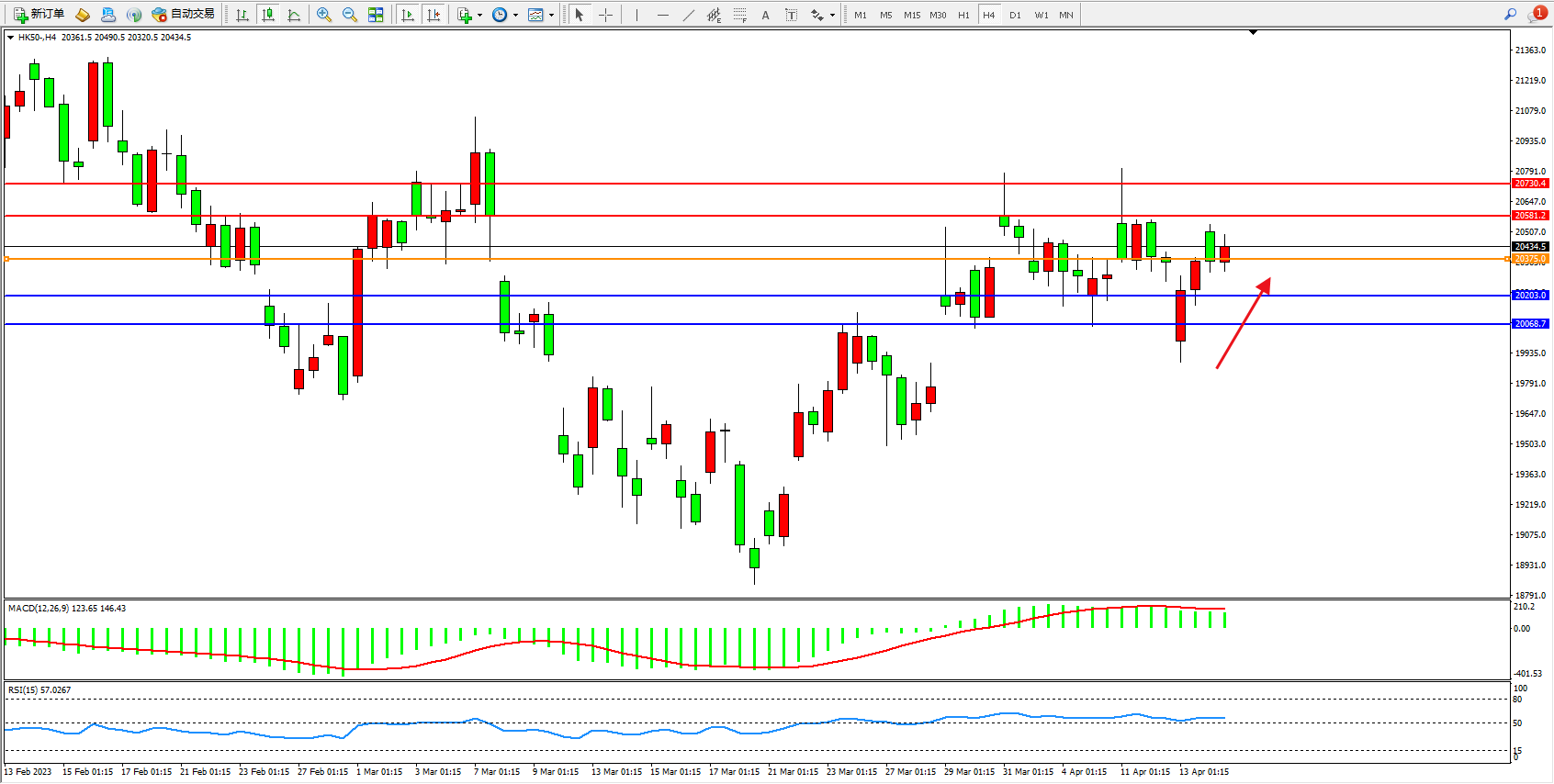 4小时图看:短期纠结高位区间震荡,市场整体多头动力有震荡上移迹象,MACD指标处于多头区域维持整理,RSI指标处于50均衡线上側弱势徘徊;