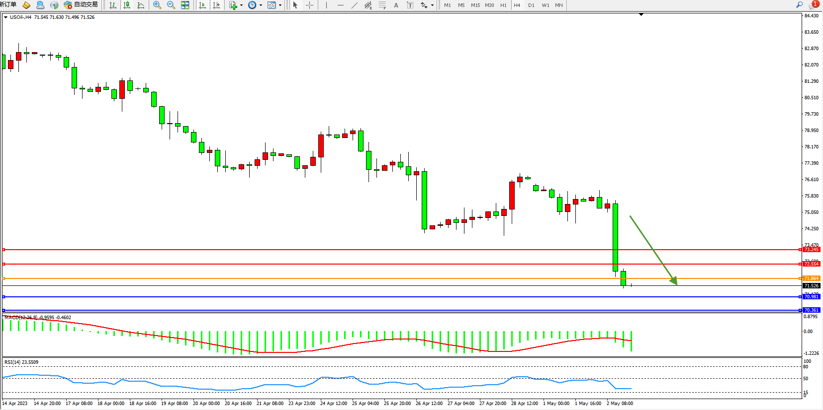 原油维持71.526附近震荡,美联储加息预期和银行业动荡令市场承压,但中国五一假期消费呈现积极迹象,美国原油出口超预期,放慢了油价下行节奏。