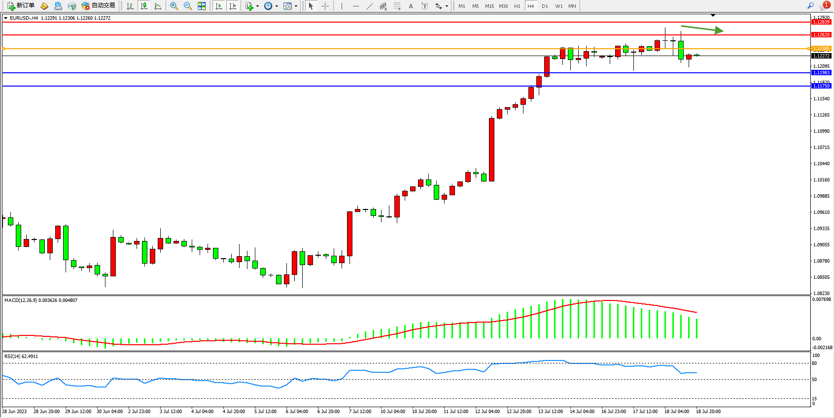4小时图看:高位短期维持整理,市场空头动力有伺机入场迹象,MACD指标处于多头区域平缓下行,RSI指标处于多头区域震荡;