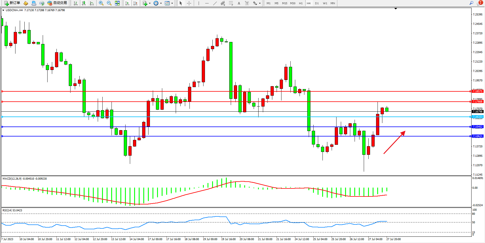 交易策略:7.16333上方看涨,目标7.17668  7.18575