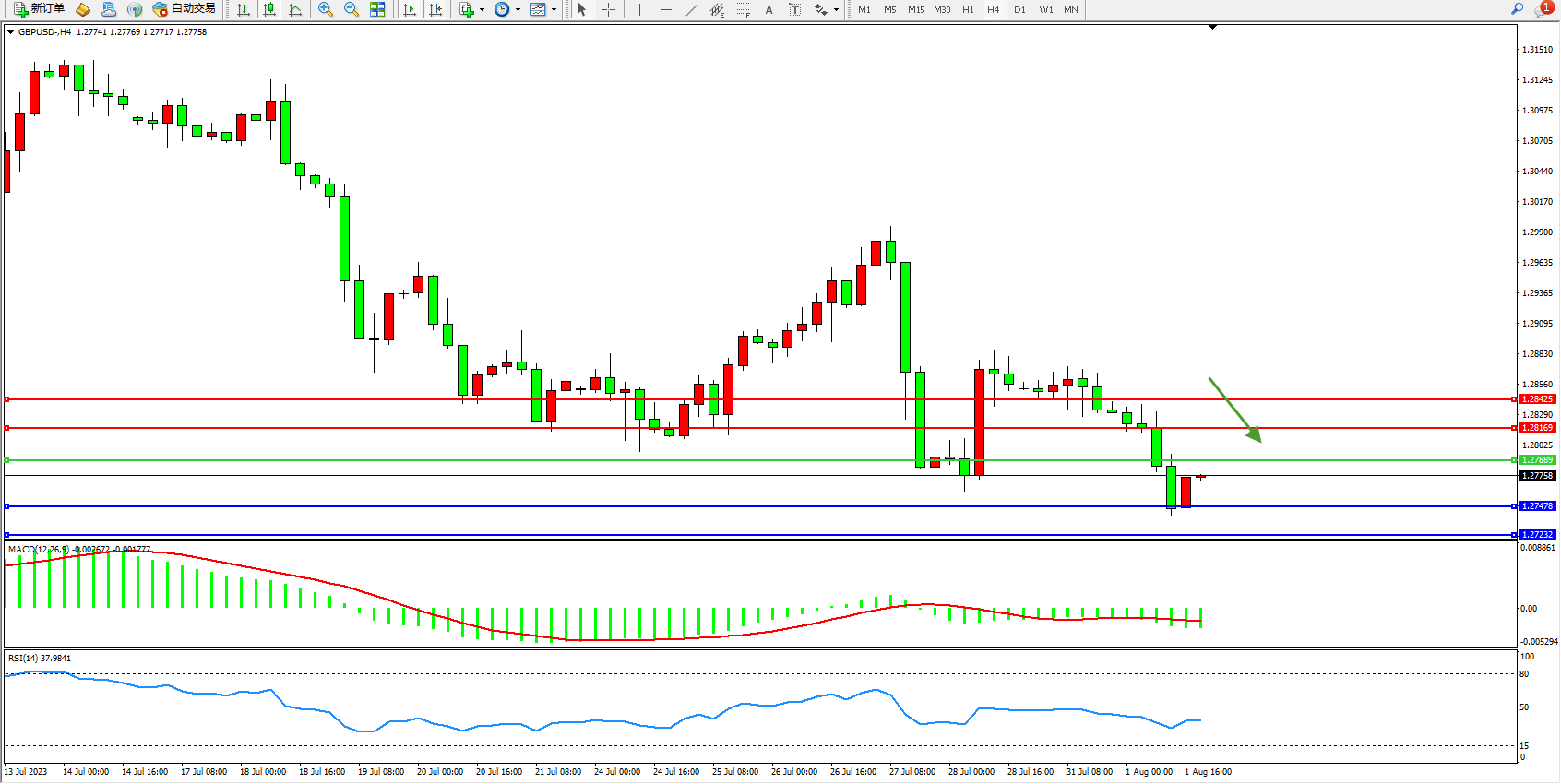 4小时图看:空头动力低位下移,短期跌势或将延续,市场空头情绪笼罩,MACD指标处于空头区域维持徘徊,RSI指标处于50均衡线下侧震荡;