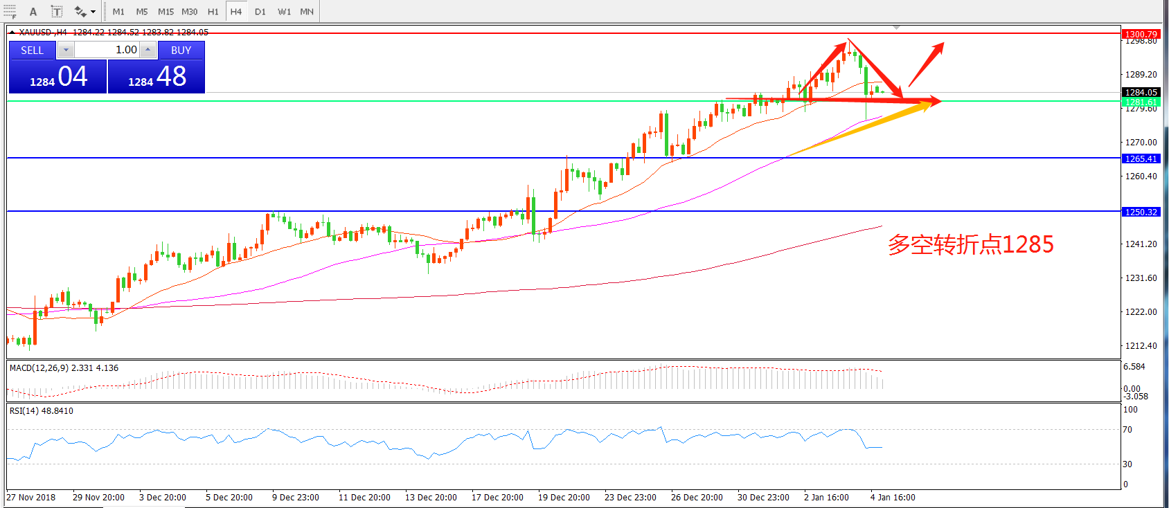 4小时图看,黄金站稳1280后强势上行,整体走势偏强,均线呈现多头排列,短期仍是偏多思路。