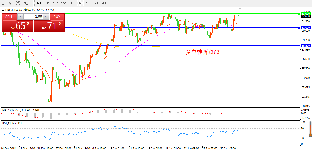 4 小时图看,油价强势突破62美金后延续震荡,整体价格处于均线支撑之上。短期均线向上, MACD红柱增加,亚盘时段如有所回落可逢低做多。