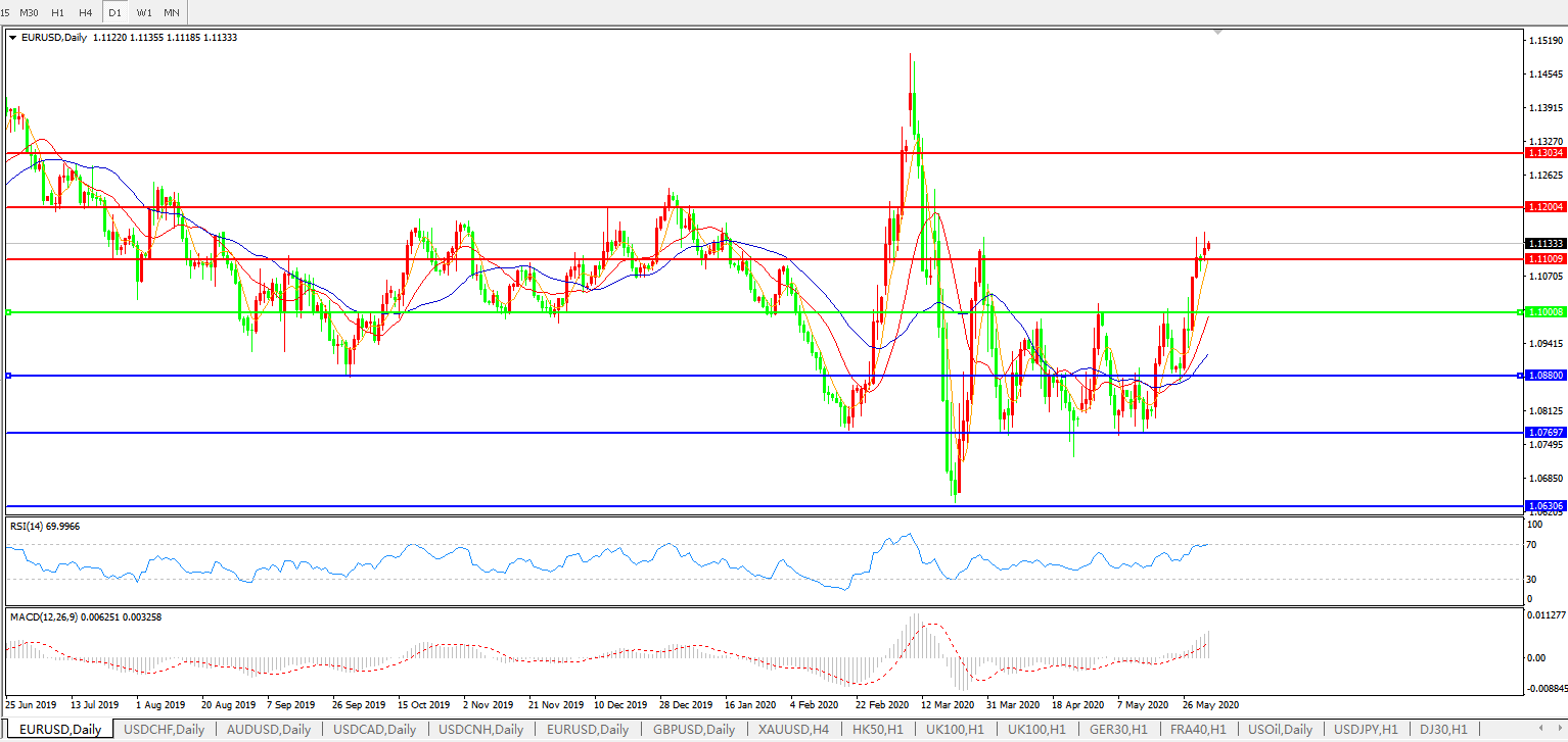 欧元区,5月制造业采购经理人指数(PMI)从4月触及的纪录低点有所回升,不过工厂活动仍大幅萎缩。然而,日本和韩国的经济活动出现了10多年来的最大降幅。OANDA高级市场分析师Edward Moya在一份报告中称,“金融市场仍乐观认为全球经济仍在复苏。”欧元兑美元一度涨0.32%至1.1136,这是欧元连续第五日上涨,是3月以来最长涨势;交易员关注3月30日高点1.1163上方的止损买盘;最新报1.1132。市场将关注欧洲央行周四的决定,可能宣布更多刺激措施,涵盖欧洲央行会期的隐含波动率下跌。
