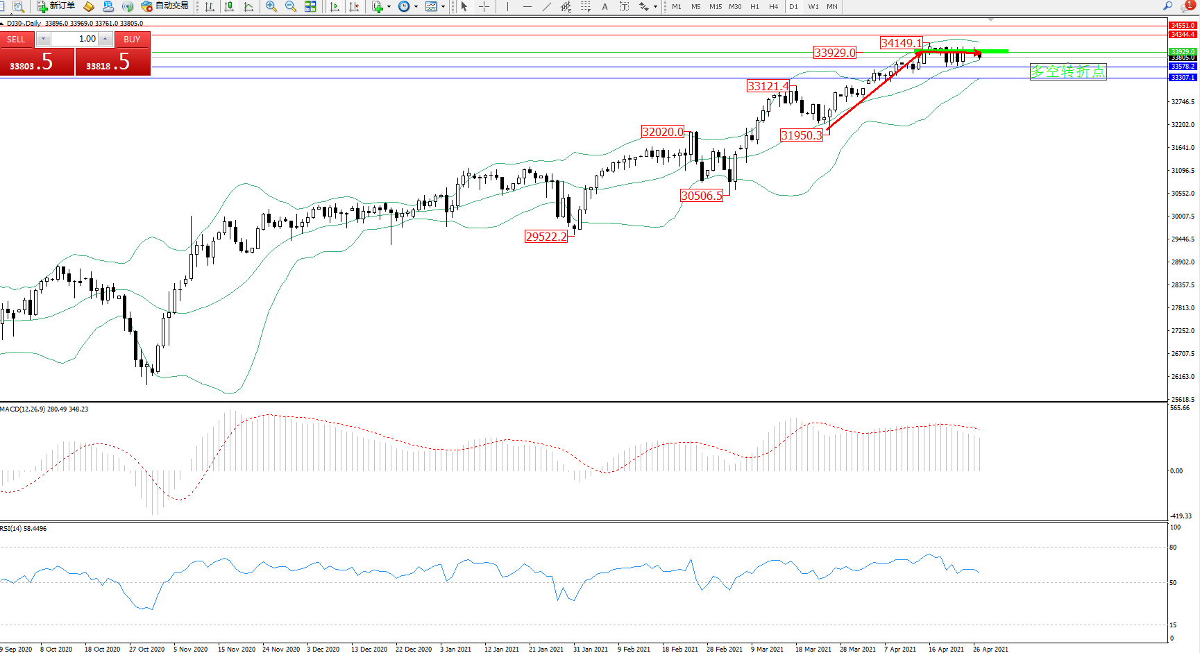 道琼斯指数4月27日(周二)收盘上涨1.85点,涨幅0.01%,报33983.42点;美股收盘,道指接近平收;科技股下跌,投资者等待一批行业巨头的业绩报告,而这些巨头企业此前带动大盘创历史新高;盈利超预期的UPS股价创新高,特斯拉结束两连涨,因其业绩未能打动投资者;3M是道琼斯指数的最大拖累者,因其警告称原材料和运输成本上涨是一个日益严重的威胁;微软在盘后交易中回吐涨幅,下跌3.5%;苹果和亚马逊将于本周晚些时候发布财报;然财报季到目前为止总体表现良好,但投资者可能在等待更强劲的节奏来推动下一轮上涨;财报利好已基本体现在当前财报季的预期之中,因此投资者正在期待大幅超预期的利好,否则股价上涨将会低迷,并可能像今天一样受到打击。