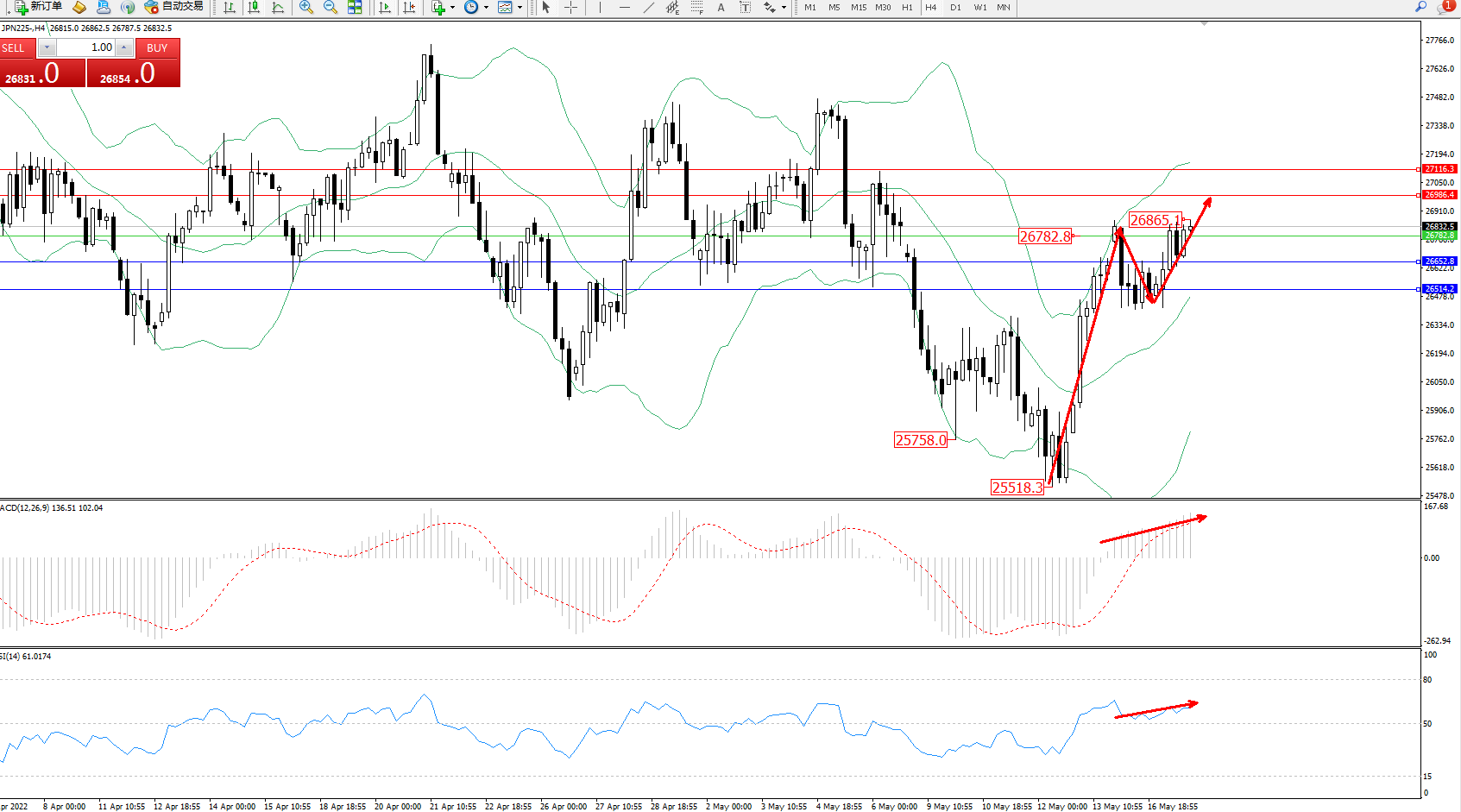技术点评:低位多头动力延续布林带指标通道中上轨区间持续震荡上扬,高位抵达26865附近节点后开始整理,短期多头动力有继续向上移动态势,布林带指标呈张口走势后开始收口上扬,MACD指标处于多头区域维持震荡不断上移,RSI指标处于50均衡线上側维持窄幅整理;