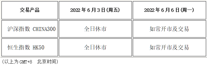 因应2022年6月3日(周五)为端午节假期,本公司以下产品的交易时间将于假期期间作以下安排,敬请留意。