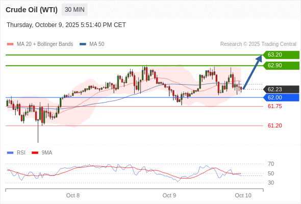 在 62.00 之上,看涨,目标价位为 62.90 ,然后为 63.20 。